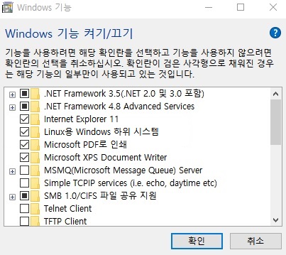 그리고 아래 사진과 같이 하위 항목 중 Linux용 Windows 하위 시스템 에 체크를 해줍니다.