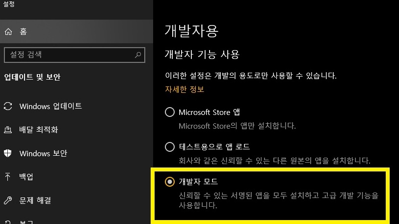 개발자 설정에 들어가면 다음과 같은 화면을 볼 수 있을 겁니다. ( 윈도우 버튼을 누른 뒤 개발자라고 타이핑 하시면 돼요 )
